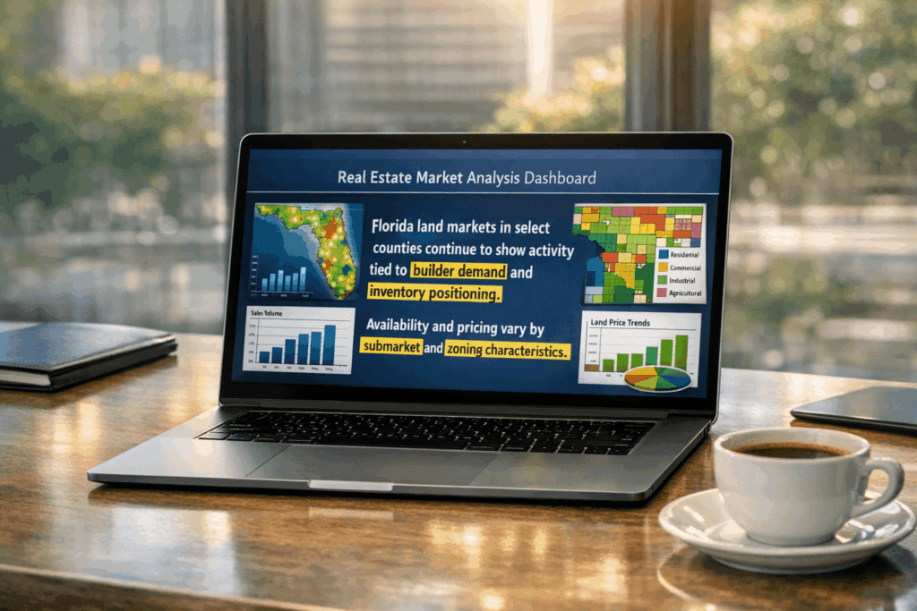 Florida land markets in select counties continue to show activity tied to builder demand and inventory positioning. Availability and pricing vary by submarket and zoning characteristics.